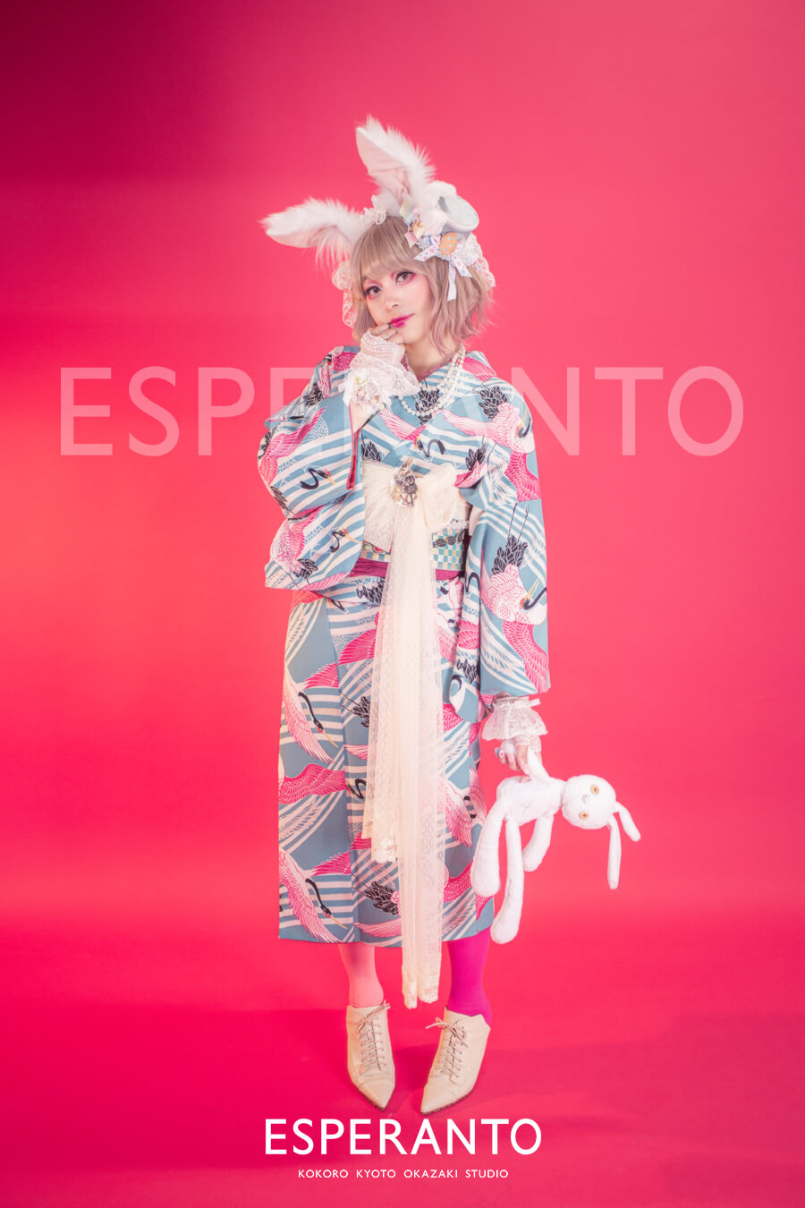 頭にはうさ耳カチューシャ、帽子にもうさ耳が付いており、よく見ると帯の上のリボンにもうさぎのブローチが付いているのにお気づき頂けますでしょうか??